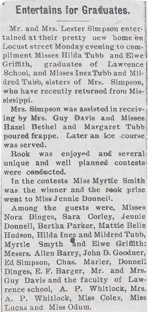 The “H. Lester Simpson House” group features photos and a clipping related to the Alexandria home of Horace Lester Simpson, Sr. (1884–1963), and Livy (Tubb) Simpson (1888–1963), who married in October 1913 and lived there until late 1919. Lester, born in Brush Creek, Smith County, was the son of Lewis Ellison “Luke” Simpson (1841–1929) and Nancy Jett Dowell (1846–1885); Livy, born in Alexandria, was the daughter of Livingston Tubb (1853–1925) and Maggie Eason Bethel (1859–1920). Included are three B&W photos of the Locust Street house (likely 1913–1919), a “Entertain for Graduates” news item noting the address.