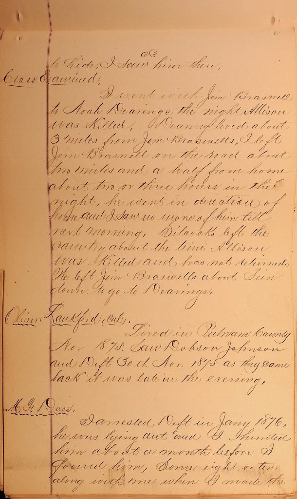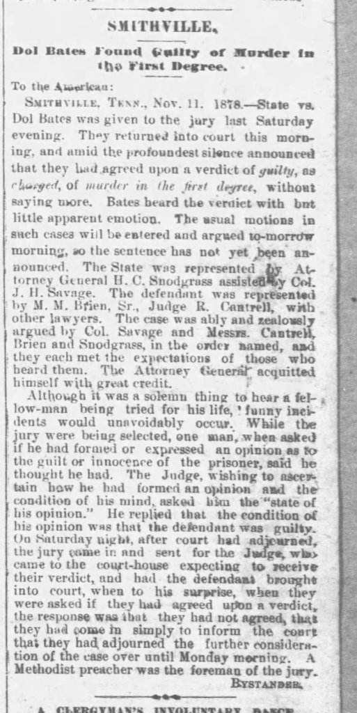 Bates remained incarcerated at the Nashville jail until his case came to trial on 8 November 1878. He plead not guilty. Many of the same witnesses appeared in this trial as appeared in the Brassell trial.
